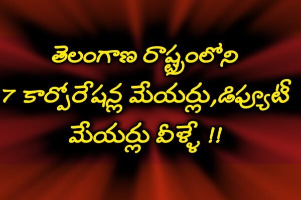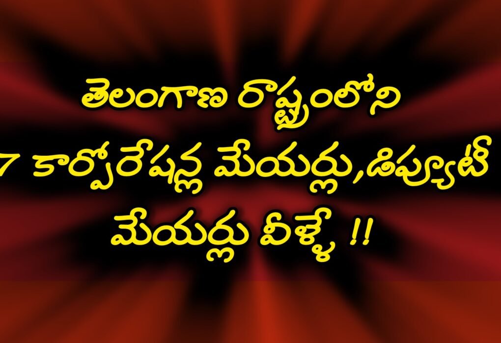 తెలంగాణలోని 7 కార్పొరేషన్లలో మేయర్, డిప్యూటీ మేయర్లు వీళ్లే 1.కరీంనగర్ కార్పొరేషన్ మేయర్ – కొలగాని శ్రీనివాస్ ( బీజేపీ ) డిప్యూటీ మేయర్ – సునీల్ రావు ( బీజేపీ ) డిప్యూటీ మేయర్ – సల్మా తహసీన్ ( ఎంఐఎం ) మేయర్ – మహంకాళి స్వామి (కాంగ్రెస్) డిప్యూటీ మేయర్ – పాతిపెల్లి ఎల్లయ్య (కాంగ్రెస్) మేయర్ – మూడ్ గణేశ్ (సీపీఐ) డిప్యూటీ మేయర్ – సిరిపురపు లలిత కుమారీ (కాంగ్రెస్)…