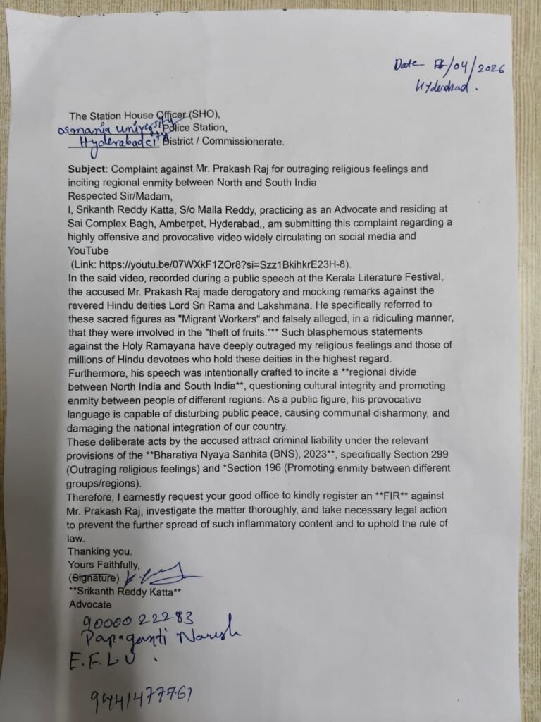 నటుడు ప్రకాష్ రాజ్పై ఓయూ పోలీస్ స్టేషన్లో ఫిర్యాదు